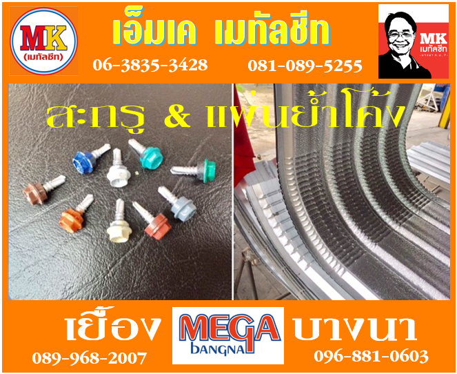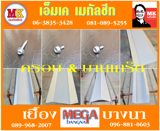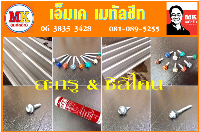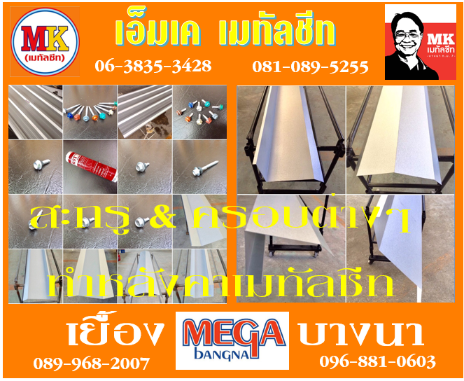 เอ็มเค เมทัลชีท ผู้ผลิตและจำหน่าย แผ่นหลังคาเหล็กเมทัลชีท เจ้าของสโลแกน “แผ่นเดียวเราก็ขาย” (A single sheet, we also sell) ผลิตและจำหน่ายแผ่นหลังคาเมทัลชีท แผ่นหลังคาเมทัลชีท ติดฉนวน แผ่นหลังคาโปร่งแสง สีขาวขุ่น แผ่นหลังคาโปร่งใส สีใสกระจก ลูกหมุนระบายอากาศ แผ่นคลอบข้าง แฟรชชิ่งทุกชนิด เหล็กกล่องสี่เหลี่ยม เหล็กฉาก เหล็กตัวซี เหล็กชุบซิ้งค์ไม่เป็นสนิม สกรูยิงแผ่นหลังคา หัวหกเหลี่ยม ซิลลิโคนกันซึม